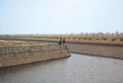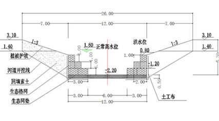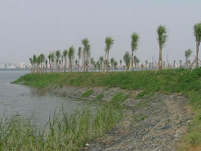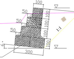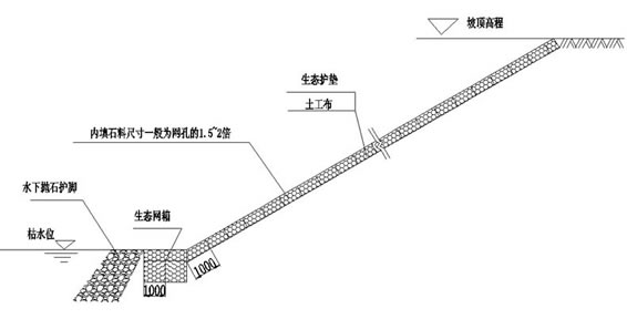 護(hù)坡結(jié)構(gòu)包括枯水位以下部位的護(hù)腳和枯水位以上部位的護(hù)坡兩部分。網(wǎng)墊厚度根據(jù)水流速度確定,以達(dá)到#優(yōu)安全性和經(jīng)濟(jì)性,一般采用厚度為0.2m-0.5m的網(wǎng)墊。坡比一般1:1.5-3,可根據(jù)土的內(nèi)摩擦系數(shù)和土與網(wǎng)墊的摩擦系數(shù)確定。
